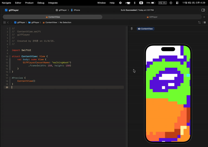 캐릭터 요소가 가미된 게이미피케이션 iOS 프로젝트를 만들고 있다.움직이는 캐릭터를 구현하기 위해 디자이너 측에서 전달해준 gif 파일을 루프 형태로 재생하기로 하였다.Lottie iOS, 이미지 시퀀스 등 다른 여러 방식에 대해서도 생각해 보았으나각각의 형태에 장단점이 존재하였고, 결국 가장 친숙한 gif 형태로 작업하는 것으로 최종 결정하였다. 다만, SwiftUI의 기본 Image View에서는 gif 재생을 지원하지 않는다.따라서 UIKit View를 SwiftUI에서 이용 가능한 프로토콜인 UIViewRepresentable을 채택해야 하고,이번 시간에는 해당 방법을 통해 SwiftUI에서 gif 파일을 재생하는 방법에 대해 알아보고자 한다. UIImageViewhttps://developer...