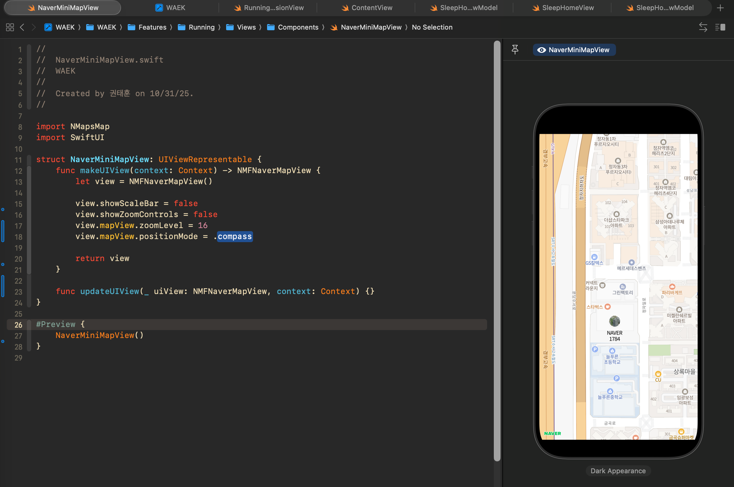 iOS 프로젝트 진행 중, 걷기/달리기 중 실시간으로 사용자의 위치를 표시해 주는 미니맵 요소가 필요하였다.이를 위해 네이버맵 SDK를 사용하기로 결정하였고 이를 연동하는 과정 중, 문제가 발생하였다.발생한 문제 및 해결한 방식에 대해 다뤄보고자 한다. 구현 방법1. 네이버 클라우드 플랫폼 등록 및 XCode 세팅https://navermaps.github.io/ios-map-sdk/guide-ko/1.html 시작하기 · NAVER Map iOS SDKNo results matching ""navermaps.github.io공식 문서의 시작하기 탭에서 잘 설명되어 있다. 아래에 약간 헷갈릴수도 있는 부분들을 추가로 정리해 보았다.본인의 경우, Swift Package Manager를 통해 의존성을 추가..